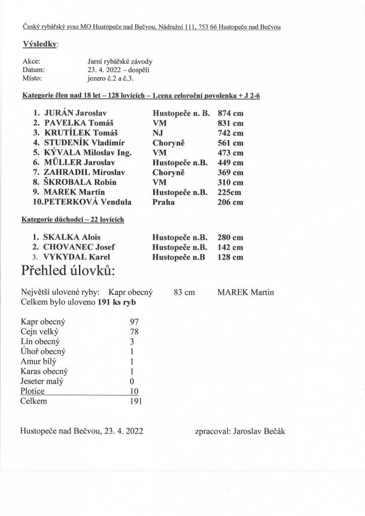 Rybářské závody 2022 - výsledky